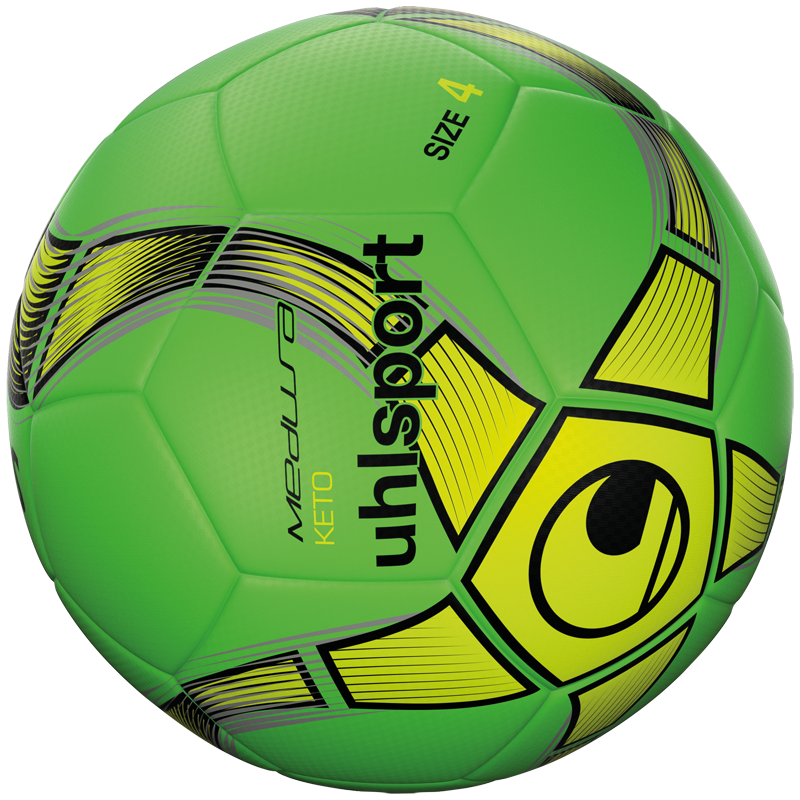Bola de futebol verde com detalhes amarelos e pretos e texto